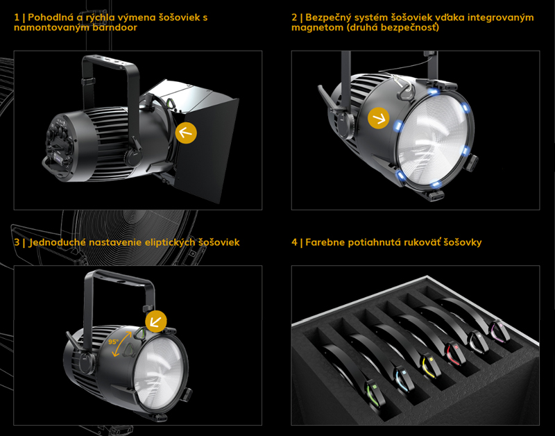 Okrem toho je tu nový „systém výmeny šošovky jednou rukou“ a je tu možnosť predvolieb stmievača, CCT a farieb, čo šetrí enormný čas pri nastavovaní. Toto je doplnené o optimalizovaný držiak, integrovanú funkcia vysielania a prijímania CRMX a samozrejme nový reflektor spolupracuje aj priamo s ROXX.APP.